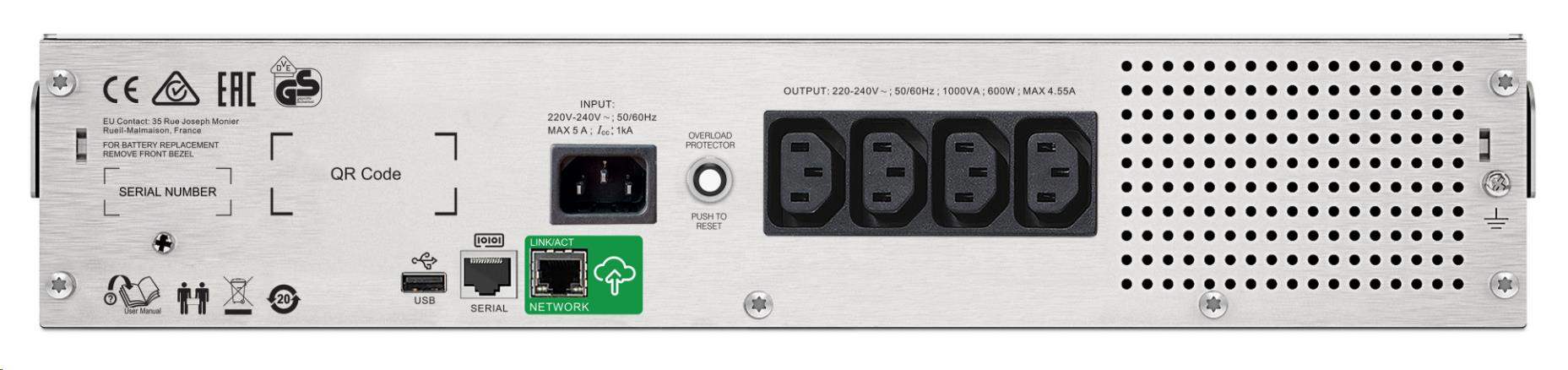 Počet výstupních zásuvek:4; Použití:Desktop, Aktivní síťové prvky; Provedení:Rackmount; Zdánlivý výkon VA:1000; Výška v Racku:2U; Topologie:Line-Interactive; Fáze (Vstup/Výstup):1:1; Komunikace:USB, DB-9 - RS-232, SmartConnect; Typ výstupu:IEC 13
