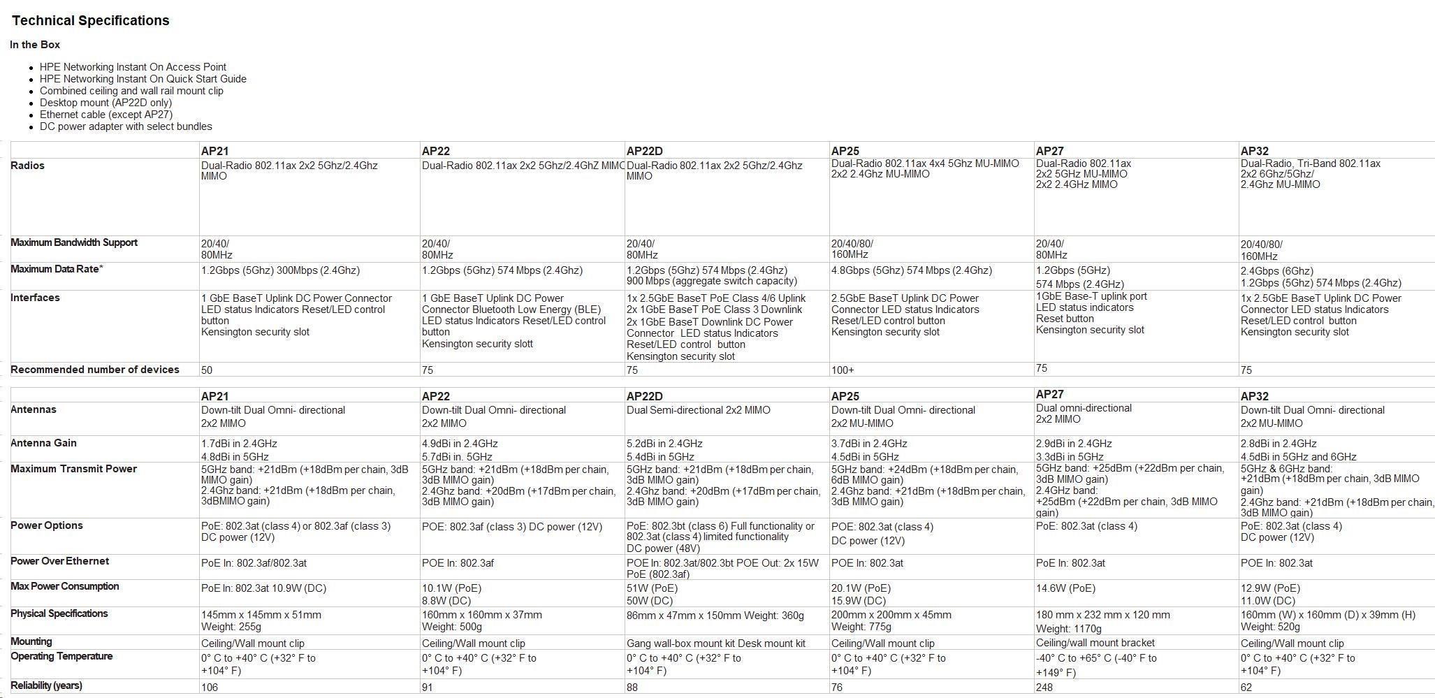 Multiuser, Multiple Input, Multiple Output (MU-MIMO) AP25 supports MIMO, allowing service to multiple clients (Wi-Fi 5 and Wi-Fi 6) at the same time. 1024-Quadrature Amplitude Modulation (1024-QAM) Enables a 25% data increase over 256 QAM, improving throughput to access points and devices. Trusted Platform Module (TPM) All Aruba Instant On access points have an installed TPM for secure storage of credentials, keys, and boot codes. Basic Service Set Coloring (BSS Coloring) Allows the network to assign a "color" tag to a channel and reduce the threshold for interference. Network performance is improved because APs on the same channel can be closer together and still transmit at the same time. Aruba Advanced Cellular Coexistence (ACC) Uses built-in filtering to automatically minimize the impact of interference from cellular networks, distributed antenna systems (DAS), and commercial small-cell or femtocell equipment. Low Density Parity Check (LDPC) Delivers high-efficiency error correction for increased throughput. Transmit Beamforming (TXBF) Delivers increased signal reliability and range. |