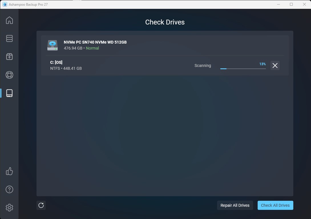 Záloha je tak bezpečná, jak bezpečný je pevný disk, na kterém je uložena! Proto Ashampoo® Backup Pro během zálohování sleduje parametry SMART vašeho pevného disku, aby odhalil budoucí problémy ještě předtím, než nastanou! Díky tomu máte čas reagovat a zabránit ztrátě dat. Program také nabízí dodatečnou kontrolu disku/oddílů, která analyzuje a opravuje jednotlivé sektory. Ať už se jedná o interní nebo externí disk, Ashampoo® Backup Pro se o vaše pevné disky postará opravdu dobře!