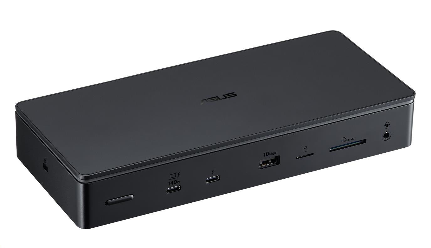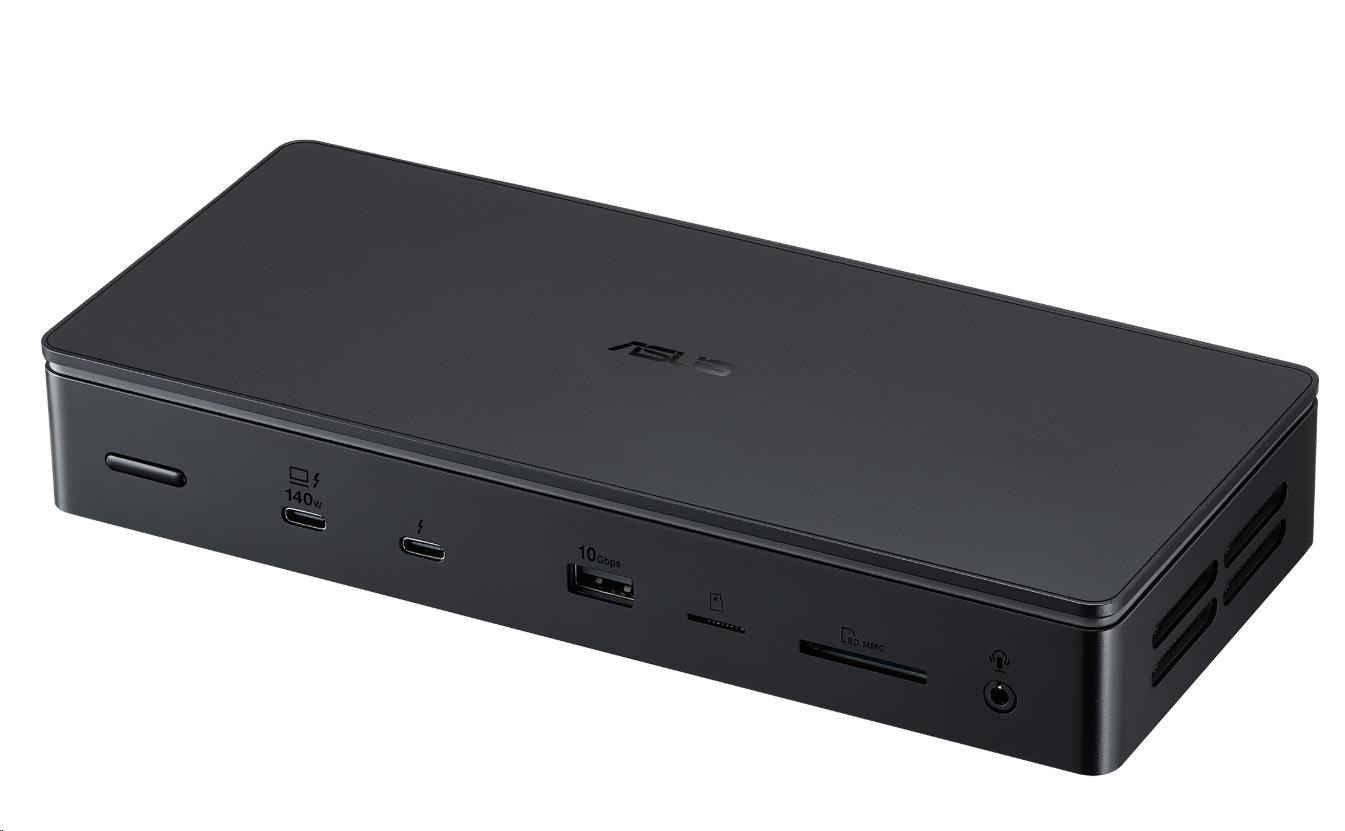 ASUS Master Thunderbolt 5 Dock je dokovací stanice 13 v 1 navržená pro tvůrce, která jim umožňuje proměnit svůj notebook ve výkonnou pracovní stanici pomocí jediného připojení kabelu. Dokovací stanice je schopna podporovat až tři 4K displeje, rychlost přenosu dat super 80 Gbps přes tři Thunderbolt 5, číst dvě paměťové karty a dokonce obsahuje slot SSD pro další úložiště. Vestavěné LED diody na spodní straně zařízení nabízejí nastavitelné okolní osvětlení, které dodává futuristickou estetiku každému kreativnímu prostoru.