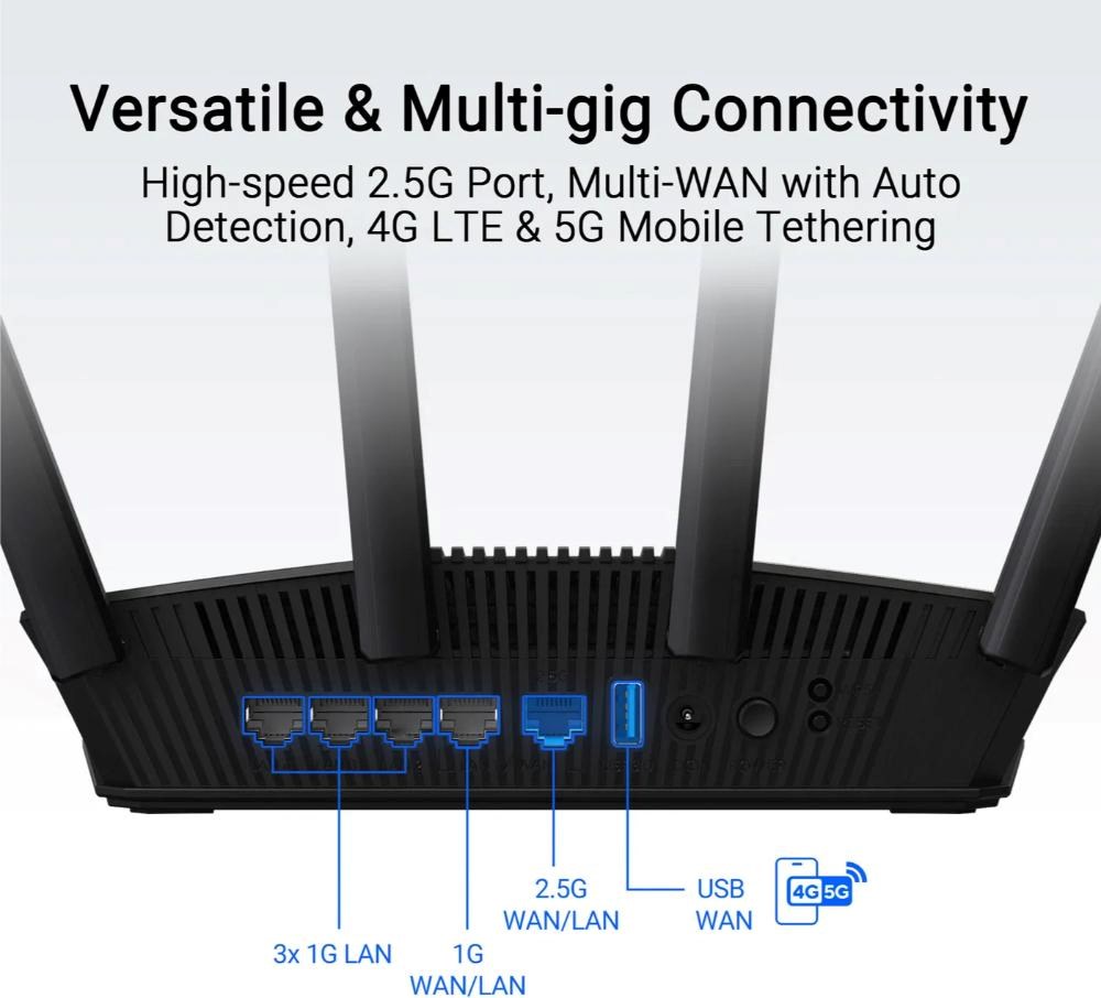 | Bezpečnost | AiProtection Pro, VPN, WPS support, WPA/WPA2/WPA3-Personal, WPA/WPA2-Enterprise, WPS, Let's Encrypt, DNS-over-TLS, SSH, Security Scan, Firewall, • Maximální počet filtrů klíčových slov firewallu :64, • Maximální počet filtrů síťových služeb firewallu :32, • Maximální počet URL filtrů firewallu :64 |