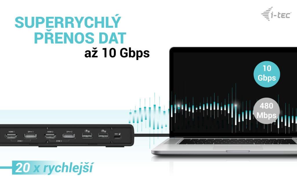 - Univerzální dokovací stanice kompatibilní s notebooky a tablety s rozhraním USB-C, USB-A a Thunderbolt.