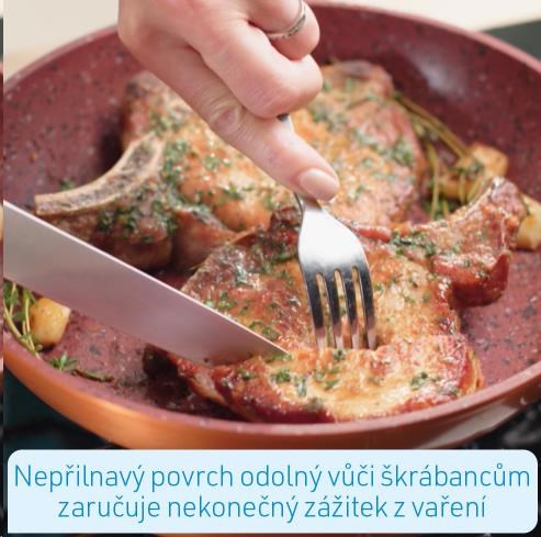 Tajemství pánve spočívá v jejích vrstvách. Hliníkový trup je kombinován s extra silnou ocelovou vložkou. Jeho základem je robustní kamenný povlak pro nesrovnatelně dlouhou životnost a akumulaci tepla. Měď zušlechťuje kamennou vrstvu pro dokonalé rozložení tepla. Senzační složení pánve završují 3 vrstvy vysoce kvalitního nepřilnavého povlaku.