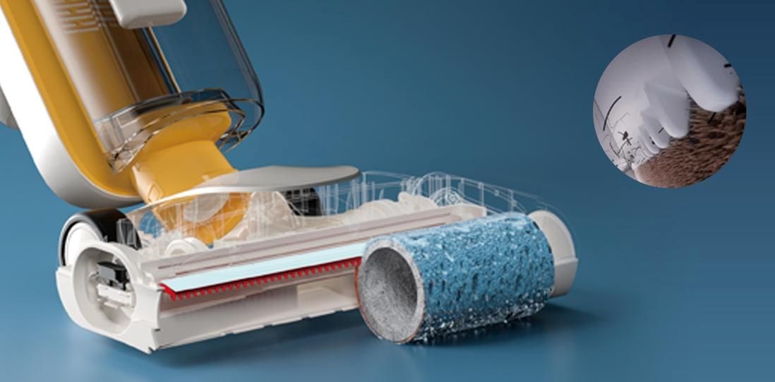 Inovativní systém MHCBS (Multi-stage Hybrid Cleaning Brush System) zajišťuje, že kartáčový válec zůstává během celého úklidu vždy čistý – bez šíření nečistot zpět na podlahu.