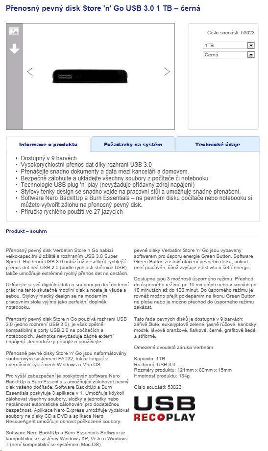 Prenosný pevný disk Verbatim Store 'n' Go 1 TB USB 3.0 Špeciálne vlastnosti: Dostupné farby: čierna, strieborná, eukalyptovo zelená, horúco ružová, karibská modrá, fialová, sopečná oranžová, opálená žltá, grafitovo sivá Ultra rýchle USB 3.0 2.5@ (6.35 cm) externý pevný disk, kompatibilný smerom nadol s USB 2.0 USB 3.0 teoretická maximálna rýchlosť prenosu dát: 5 Gb/s -> až 10x rýchlejší ako USB 2.0 FAT-32 predformátovaný, okamžite pripravený na použitie v PC aj Mac Vrátane rozsiahleho softvérového balíka: Zálohovací softvér na jednoduché zálohovanie súborov z počítača na externý pevný disk, softvér na úsporu energie Green Button, kontroluje spotrebu energie disku, formátovací softvér na jednoduché (pre)formátovanie externého pevného disku 2 roky záruka výrobcu Hmotnosť produktu: 184 gramov Rozmery produktu: 80 mm x 121 mm x 15 mm (š x d x v) Systémové požiadavky: PC alebo Mac s USB 3.0 / USB 2.0 / USB 1.1 Port Windows XP / Vista / Windows 7 Mac OS X 10.4 alebo vyššia Jadro Linuxu 2.6 alebo vyššia.