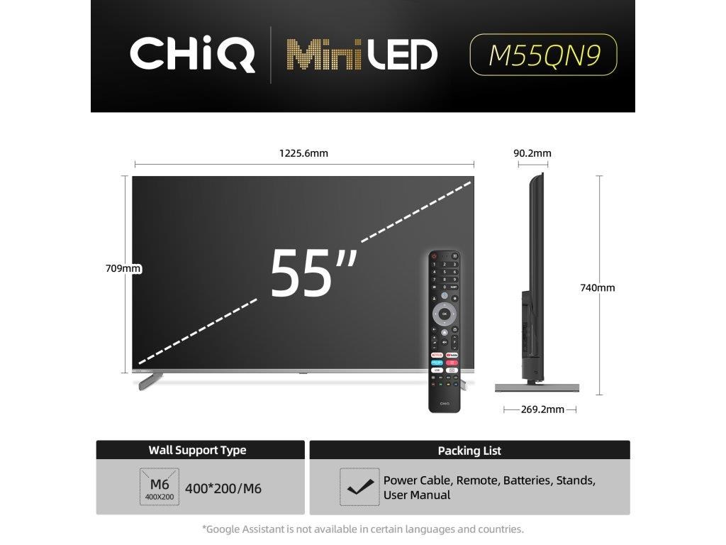 CHiQ M55QN9V, 55" (139 cm), metalická bezrámečková Smart MiniLED Google TV 5.0, Ultra HD (4K), DLG 120 Hz, MEMC, lokální stmívání, Dolby Atmos, Dolby Audio, dbx-tv, HDR 10, HLG, Dolby Vision, WiFi 2,4/5G, Bluetooth 5.0, webový prohlížeč, Google Assistant, Chromecast, O2 TV, YouTube, Netflix, Prime Video, paměť 2GB+16GB, 4x HDMI, 2x USB, CI slot, 20 W, energetická třída F.