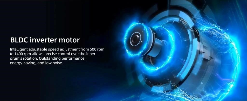 Pračka je vybavena vysoce účinným invertorovým motorem BLDC pro ultratichý a energeticky úsporný provoz. Elektronická regulace otáček od 500 do 1400 otáček za minutu minimalizuje vibrace, umožňuje vysoký výkon a přesné otáčení bubnu.