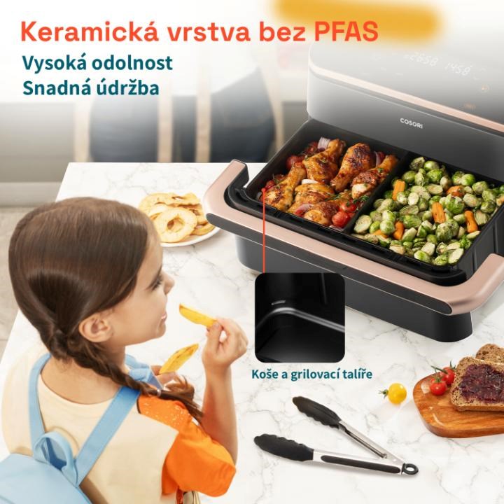 Keramická vrstva košů a grilovacích talířů je zcela bez PFAS (teflon) a nabízí mnohem vyšší odolnost a jednoduchou údržbu.