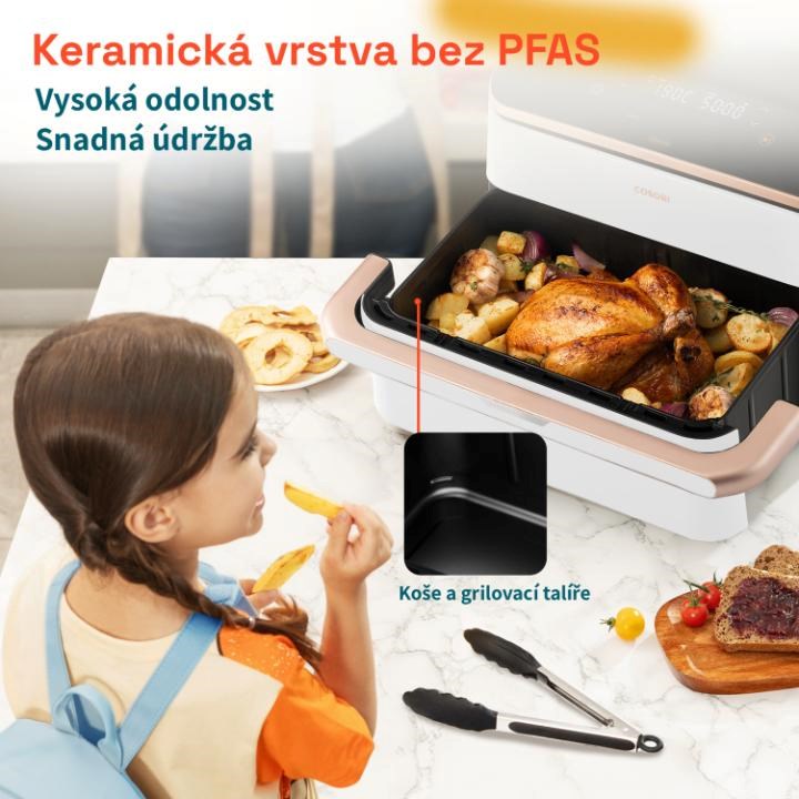 Keramická vrstva košů a grilovacích talířů je zcela bez PFAS (teflon) a nabízí mnohem vyšší odolnost a jednoduchou údržbu.