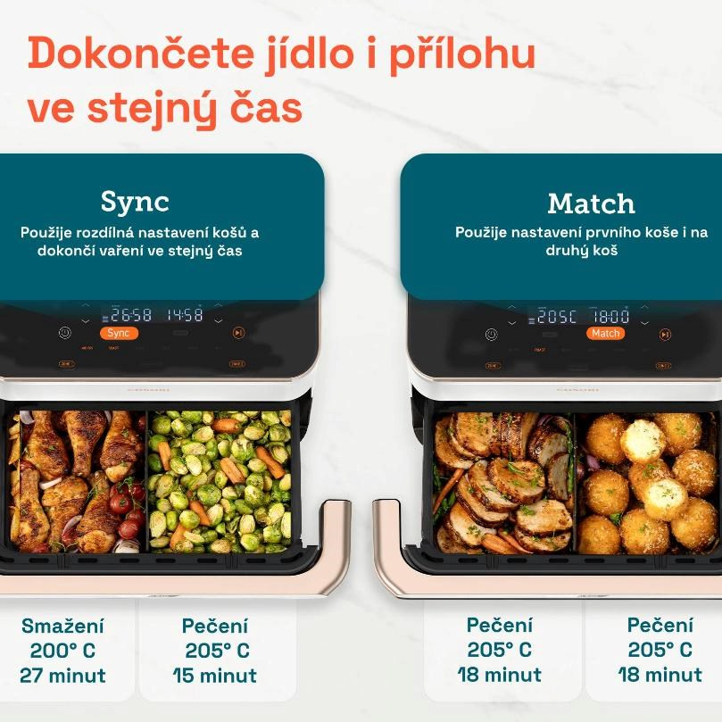 S funkcí Sync navíc fritéza sladí přípravu obou tak, že vaření bude dokončeno ve stejný čas a vy budete mít své jídlo perfektní, čerstvé a chutné.