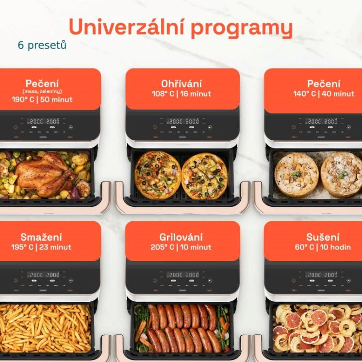 Cosori TwinFry zvládne díky šesti programům péct, fritovat, grilovat, péct sladké i slané a také sušit.