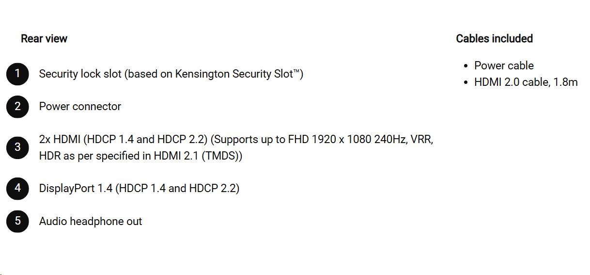 Rozlišení displeje:1920x1080 (Full HD); Úhlopříčka displeje ("):27; Výbava:VESA montáž; Rozhraní vstup:HDMI; HDMI počet:1; HDMI verze:2.1; Doba odezvy (ms):5; Formát obrazovky:16:9; Typ panelu:IPS; Jas (cd/m2):300; Kontrast:1:1000; Povrchová úprava displeje:Matný; VESA rozměry:100x100; Standardní záruka (roky):3; Rozhraní:DisplayPort