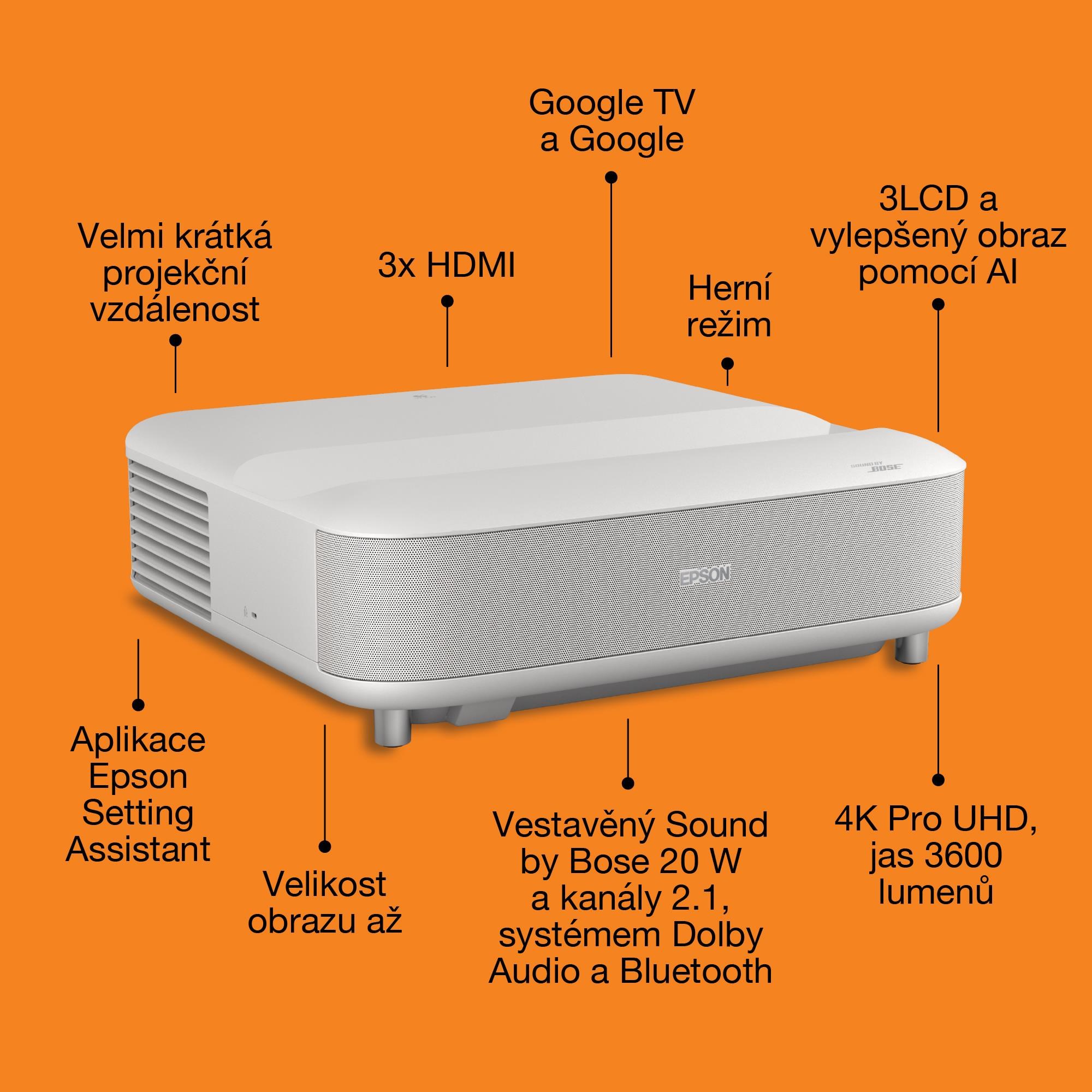 Použití projektoru: Domácí kino / hraní her / streamování / televize a set-top boxy; Typ projekce: Ultra Short Throw (UST); Skutečné rozlišení projektoru: 4K PRO-UHD (3840 × 2160); Projekční poměr: 16:9; Projekční vzdálenost (min) (m): 0,3; Projekční vzdálenost (max) (m): 0,7; Úhlopříčka obrazu (max) ("): 120; Technologie: 3LCD (RGB se závěrkou s kapalnými krystaly C2 Fine); Zdroj světla: Laser (životnost až 20 000 h); Kontrast (hodnota : 1): 5 000 000; Jas (ANSI lumenů): 3 600; Zvuk: Sound by Bose + Dolby Audio + Bluetooth (20 W 2.1kanálový systém); Smart funkce: Google TV, Google Assistant, Chromecast, režim ALLM