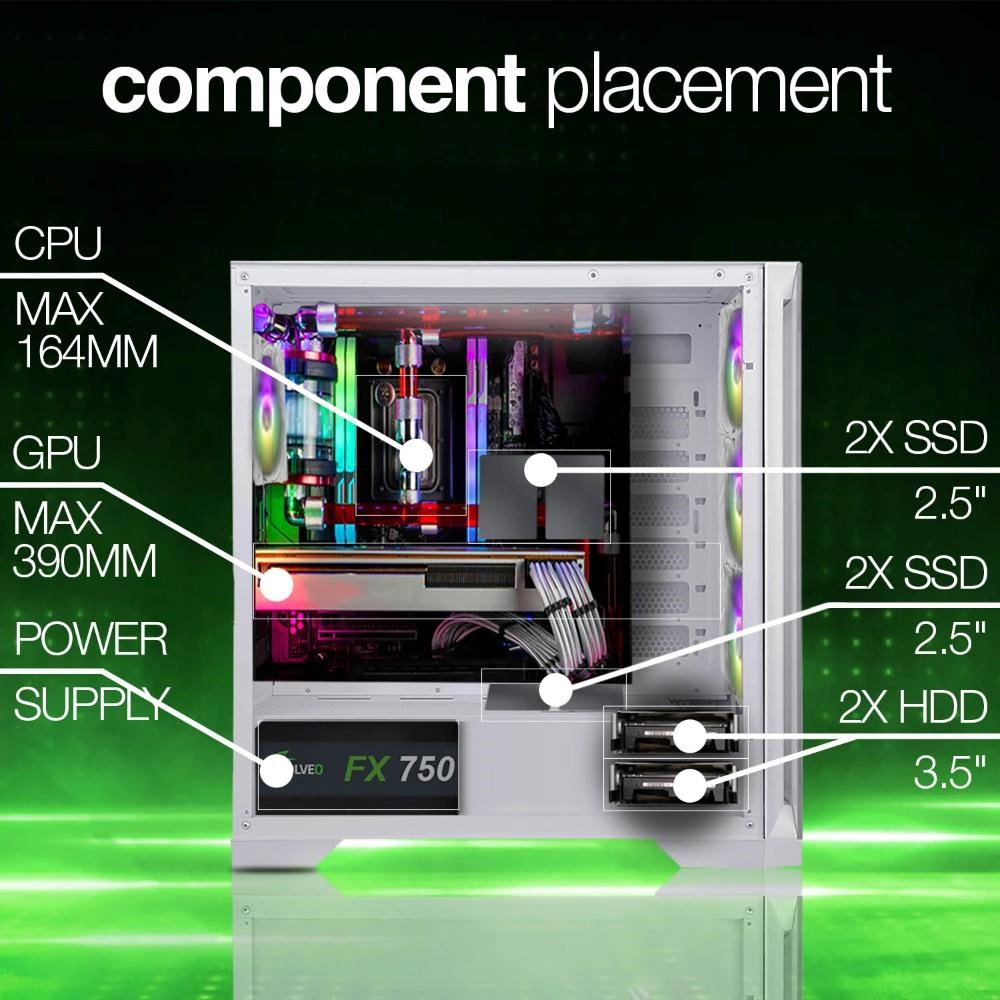 Skříň navíc chladí 4 ARGB ventilátory (tři vepředu a jeden vzadu), které jsou nejen praktické, ale i stylové – počítačové věži zajišťují optimální teplotu a taky ji umí rozzářit pestrými barvami. Díky svému tichému chodu (20,5 dB) přitom zbytečně nevyruší vaše okolí, ani když se rozhodnete vyvolat válečnou vřavu uprostřed noci.