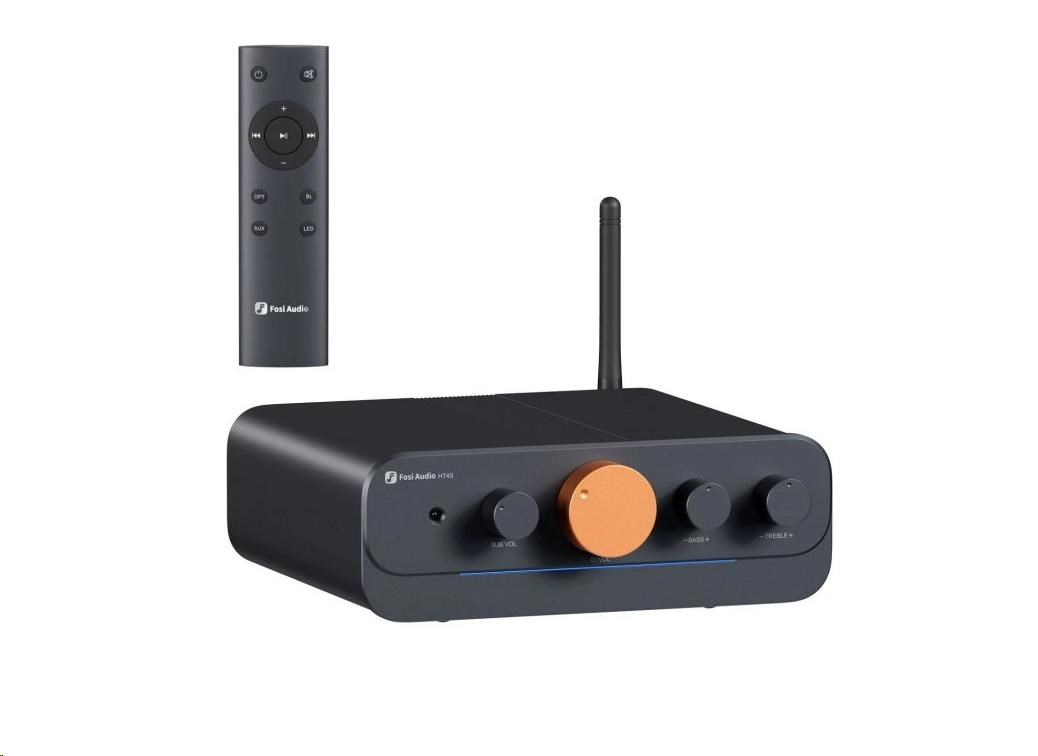 Vícekanálový zesilovač s DAC a LED indikací v celokovovém těle. Nabízí až 5kanálový výstup (4.1 / 5.0). Výkon 5x 50W/4x 60W @ 4?. THD ? 0,03 %, SNR ? 88 dB, impedance 4–8 ?. Vstupy: Bluetooth, 3,5 mm AUX a optický. Výstup pre-out. Korekce basů a výšek, přepínání režimů. Rozměry 155 × 183 × 51 mm. Součásti balení: BT anténa, napájecí kabel, 3,5mm kabel, dálkový ovladač, uživatelský manuál.