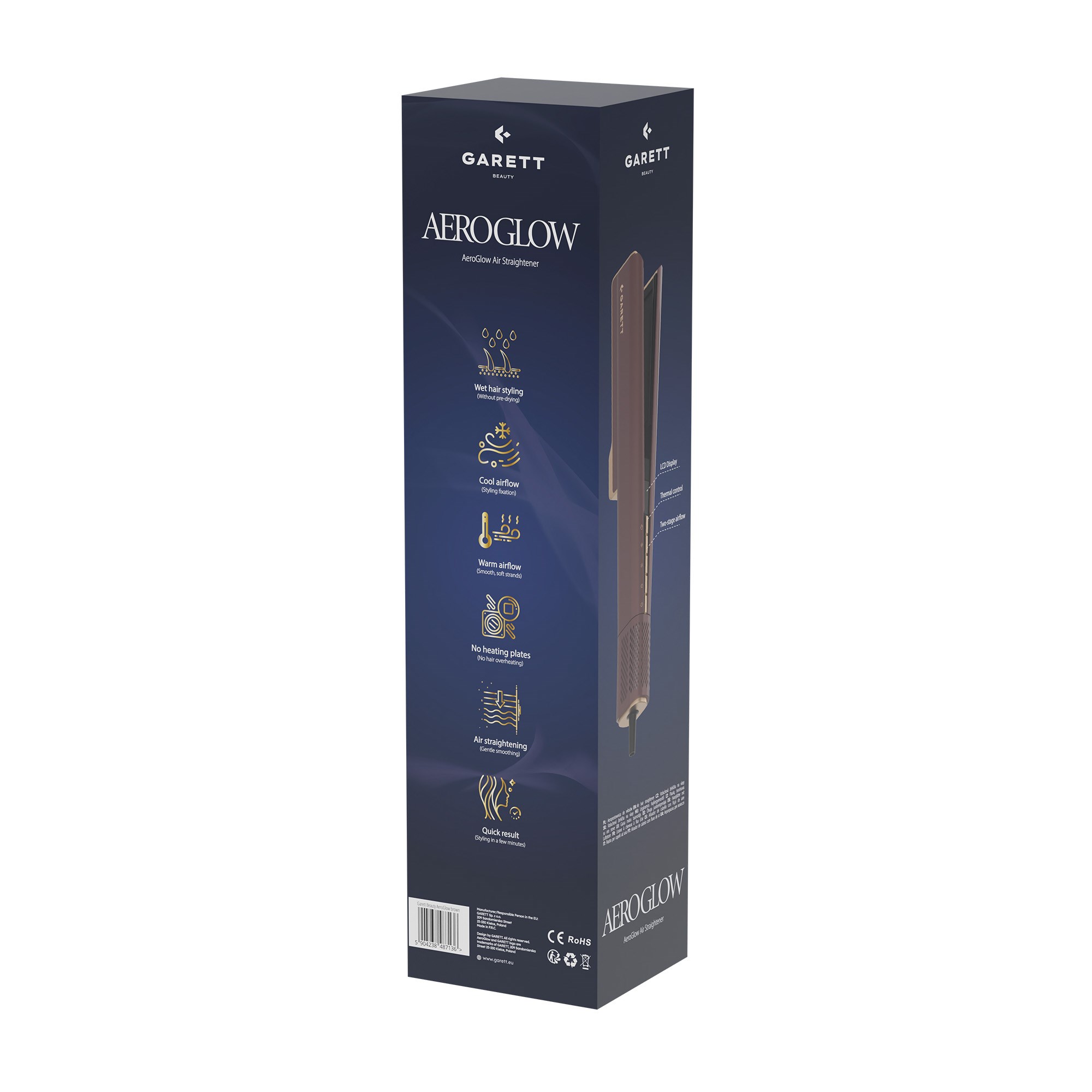 Žehlička na vlasy Garett Beauty AeroGlow - sušení a vyhlazení proudem teplého nebo studeného vzduchu. Inovativní technologie stylingu vzduchem narovnává vlasy pomocí přesně řízeného proudu studeného nebo teplého vzduchu – bez přímého kontaktu s vysokou teplotou, bez horkých destiček, pro mokré i suché vlasy všech typů. Přirozená hladkost bez krepatění. Rychlý styling za pár minut.