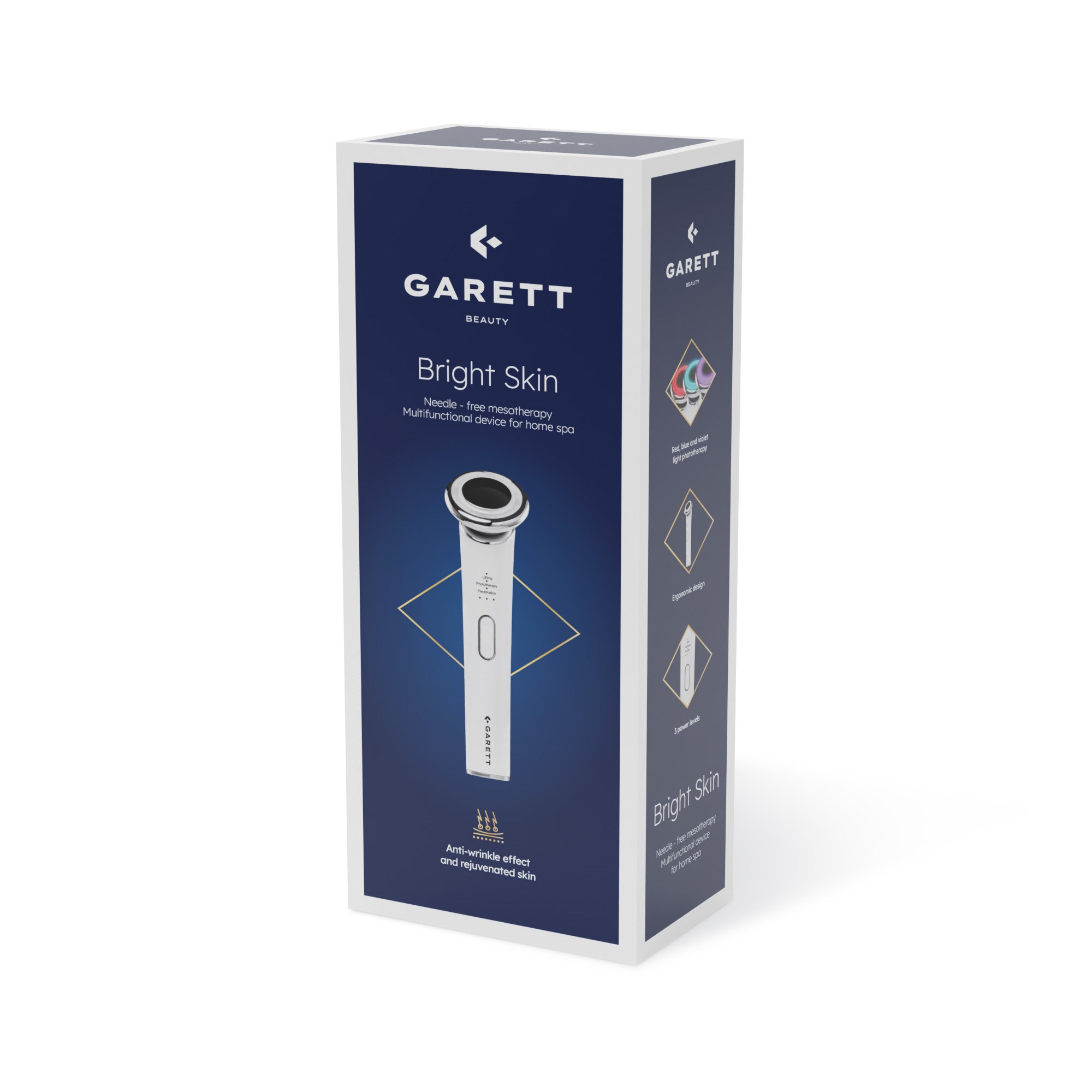 Garett Beauty Bright Skin bezjehličková mezoterapie je kosmetický přístroj, který kombinuje EMS, RF, LED a vibrace na omlazení, zpevnění a regeneraci pleti.