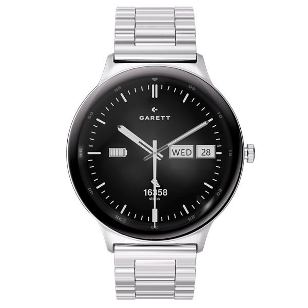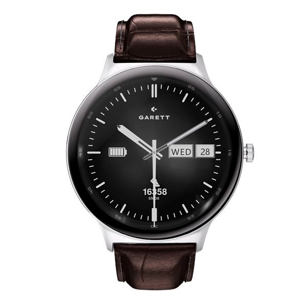 Elegantní chytré hodinky s 1,43” AMOLED displejem (466 × 466 px), ochranou Gorilla Glass a ultratenkým pouzdrem o tloušťce 7,5 mm. Nabízejí Bluetooth hovory, monitoring zdraví (tep, krevní tlak, SpO2, stres), sledování spánku a více než 100 sportovních režimů. Výdrž až 7 dní na jedno nabití, voděodolnost IP68, kompatibilita s Android a iOS (Garett Smart). Součástí balení je ocelový i kožený řemínek.