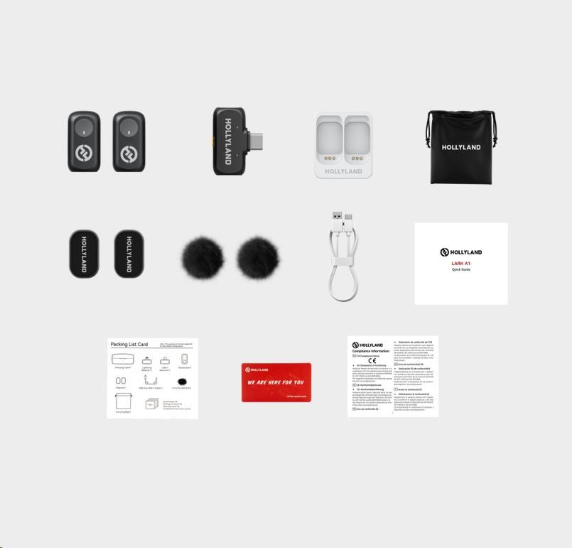 Balení obsahuje dva malé a lehké vysílače s vestavěnými mikrofony, které se bez námahy připnou na oblečení. Přijímač USB-C se připojuje přímo k zařízení a poskytuje bezproblémový provoz plug-and-play bez dalších adaptérů nebo kabelů.