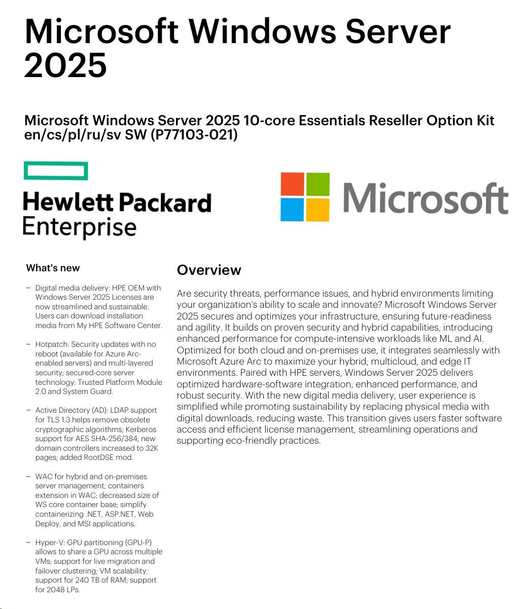HPE Microsoft Windows Server 2025 10-core Essentials Reseller Option Kit CZ (25/50user/dev en/ru/po) OEM