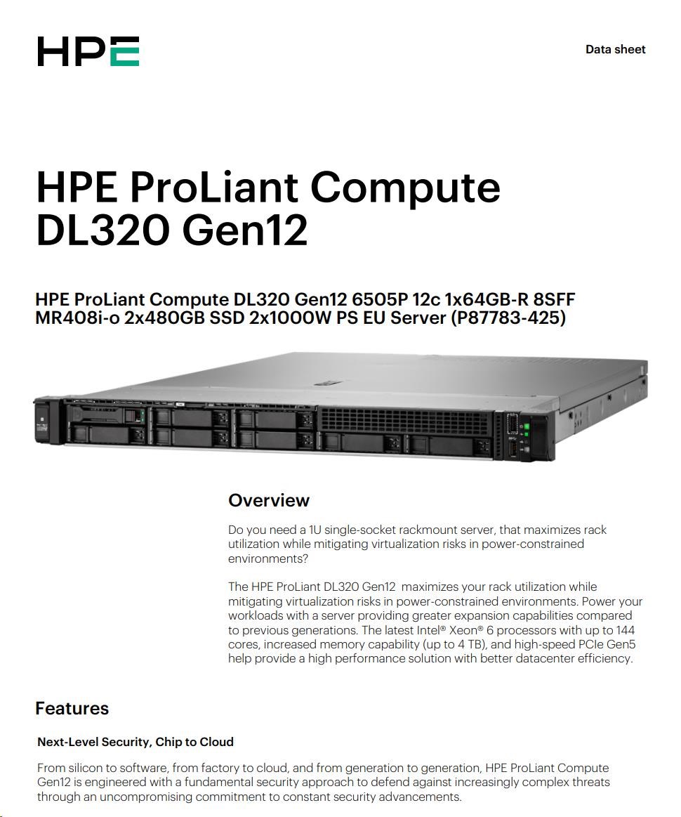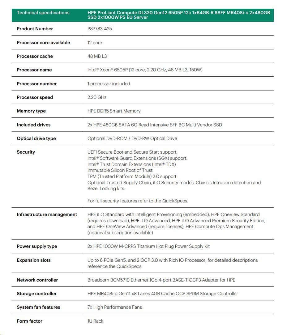 Provedení serveru:Rack, 1U Rack; Výrobce CPU:Intel; Maximální počet procesorů:1; Řada procesorů:Intel 12 Core Xeon; Model procesoru:Intel Xeon 6505P; Velikost paměti RAM (GB):128; Maximální paměťová kapacita serveru (GB):1024; Maximální počet slotů PCIe:2; Maximální počet HDD v serveru:8; Hot-plug cage pro HDD:2.5" SFF; RAID:1, 5; Redundantní zdroj