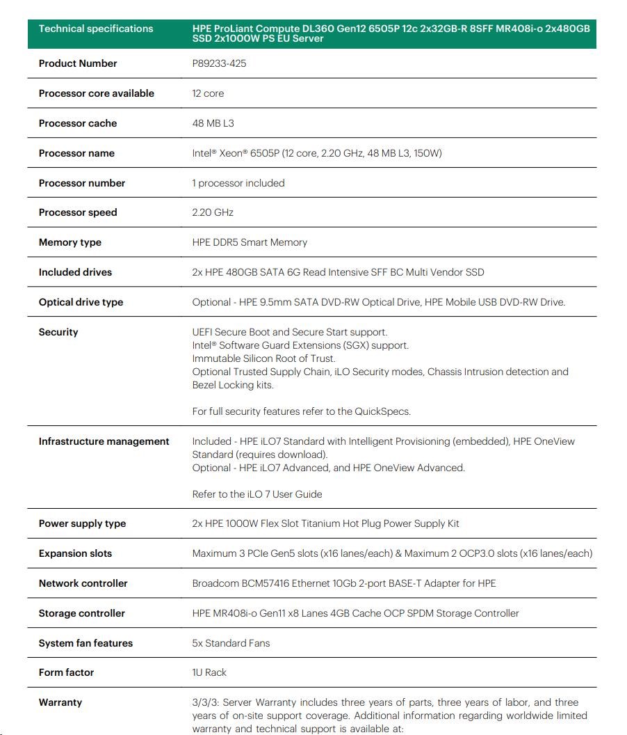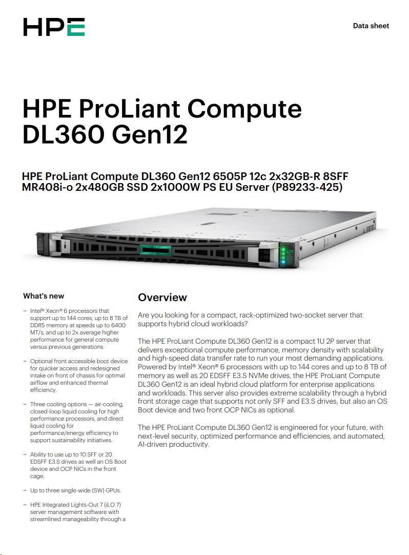 HPE PL DL360g12 6505P (2.2G/12C) 2x32G (P69727) 2x2.4TB MR408i-o 8SFF 2x1000W 2p10GbE NBD333 Smart Choice