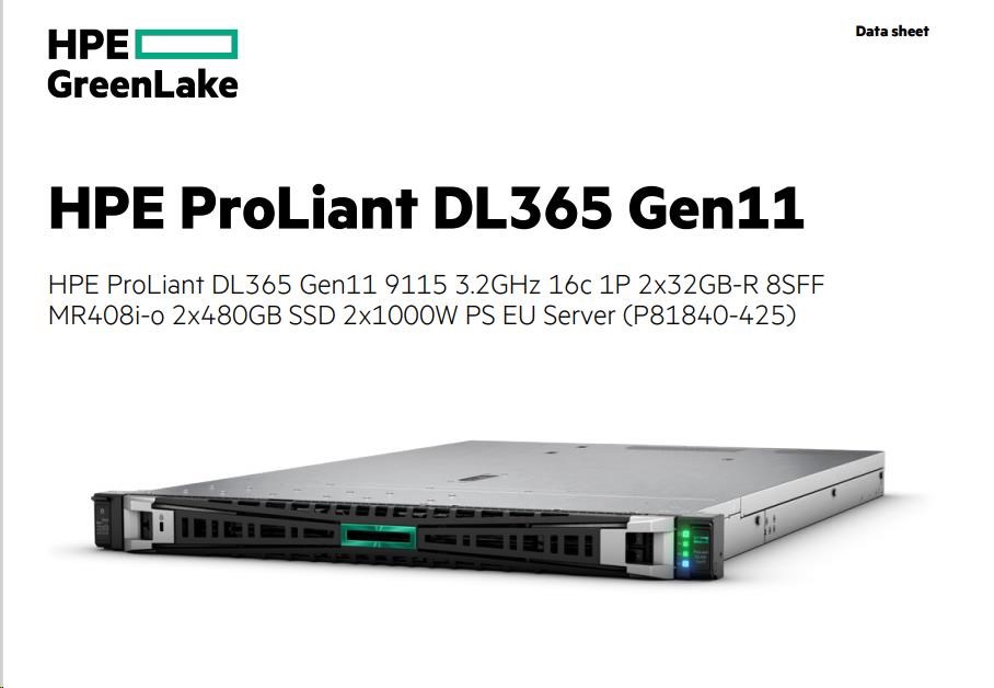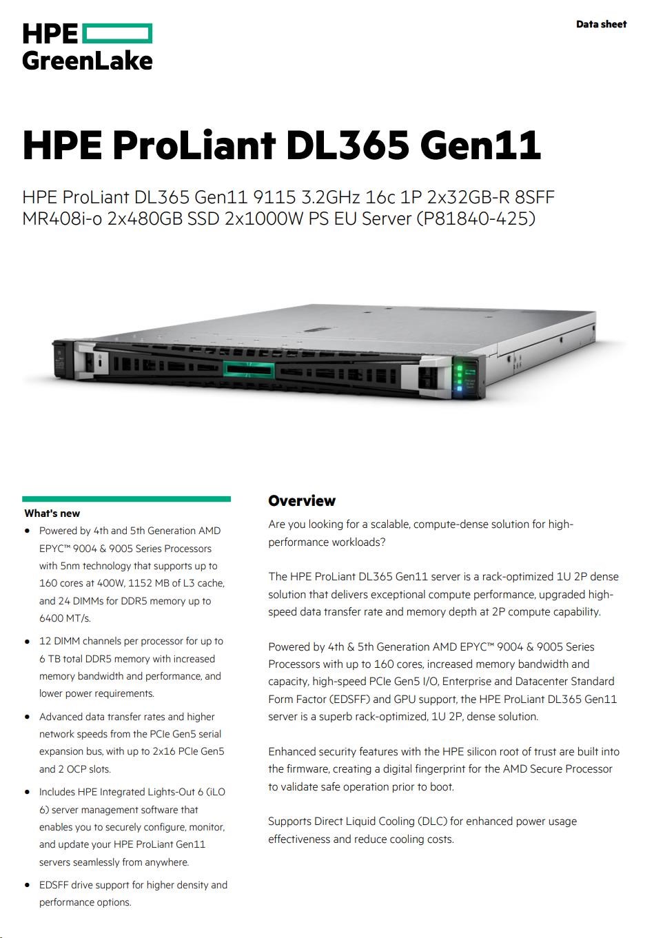HPE PL DL365g11 AMD Epyc 9115 (2.6/16C) 2x32G 2x480G MR408i-o/4G ocp 2p10G-T 8SFF 2x1000W 1U Smart Choice