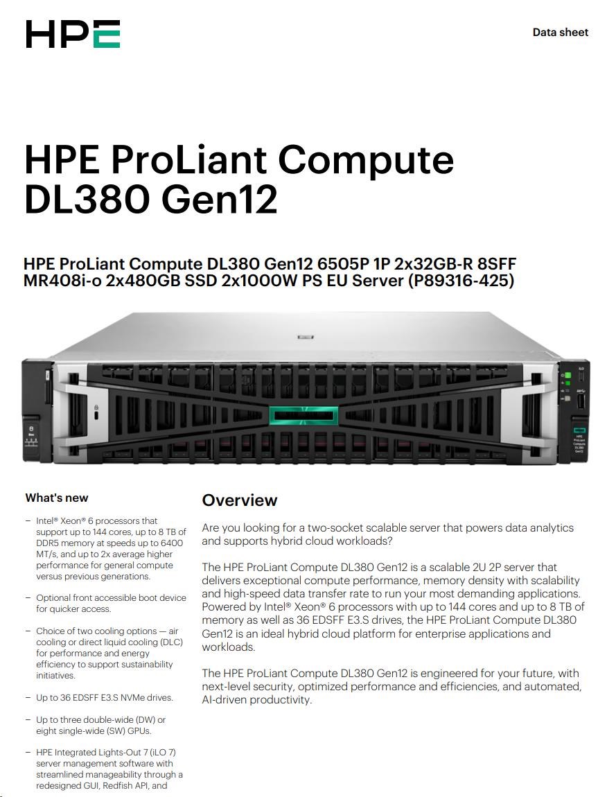 HPE PL DL380 Gen12 6505P (2.2/12C) 2x32G (P69727) 2x480G MR408i-o 8SFF 2x1000W 10GbE NBD333 Smart Choice