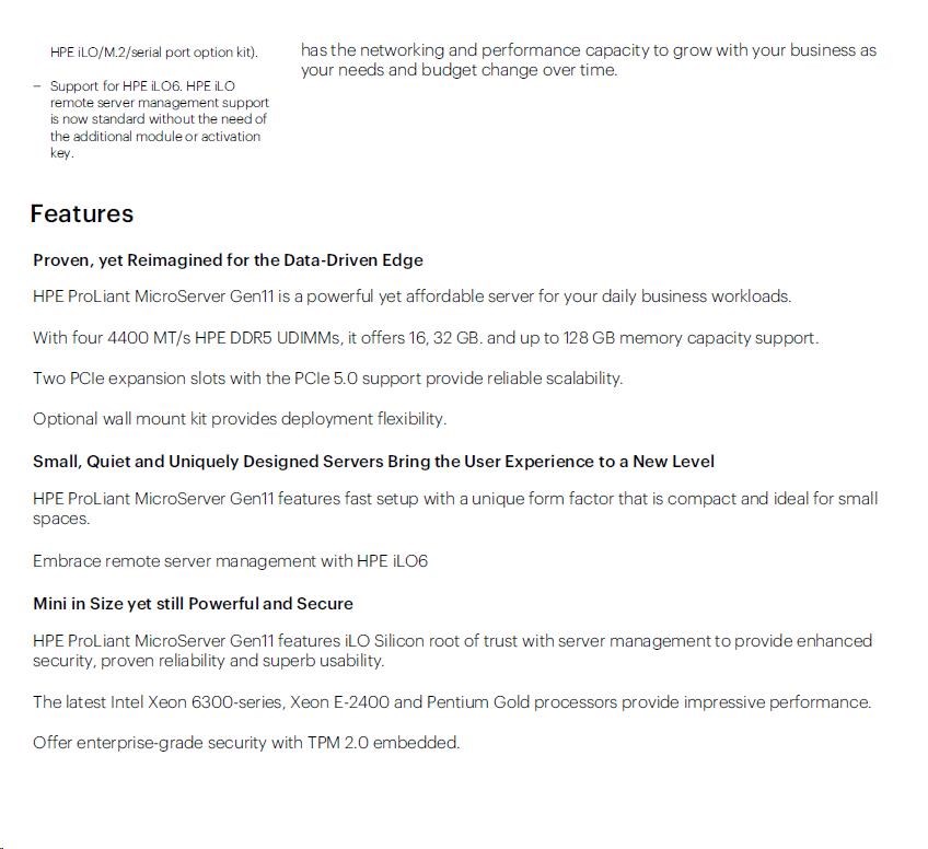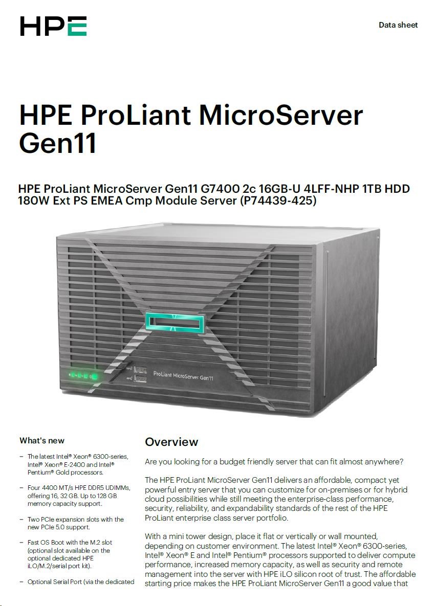 P74439-425: HPE ProLiant MicroServer Gen11 G7400 2c 16GB-U 4LFF-NHP 1TB HDD 180W Ext PS EMEA Cmp Module Server |