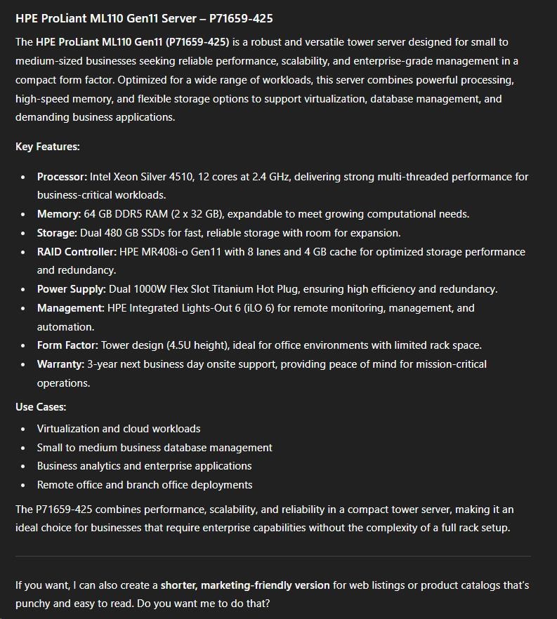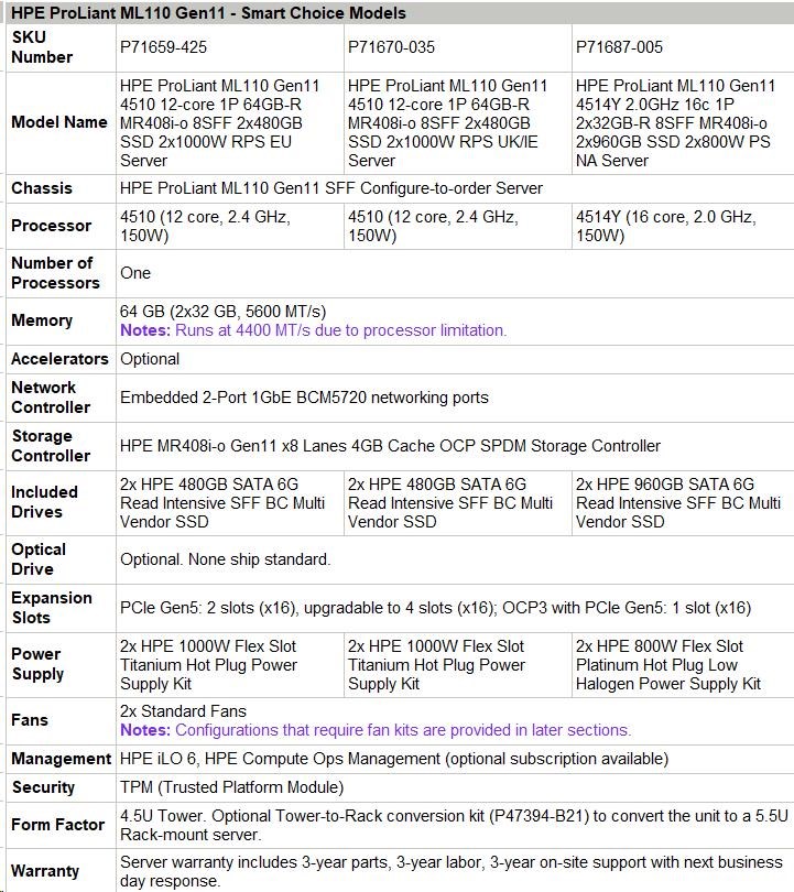HPE ProLiant ML110 Gen11 4510 12-core 1P 64GB-R MR408i-o 8SFF 2x480GB SSD 2x1000W RPS EU Server |
