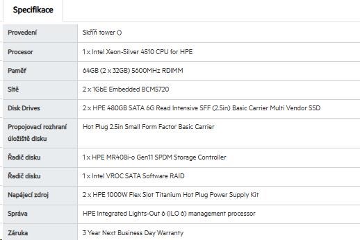 Provedení serveru:Tower; Výrobce CPU:Intel; Maximální počet procesorů:1; Řada procesorů:Intel 12 Core Xeon; SSD Kapacita (GB):480; Model procesoru:Intel Xeon 4510; Velikost paměti RAM (GB):64; Maximální paměťová kapacita serveru (GB):3072; Maximální počet slotů PCIe:5; Maximální počet HDD v serveru:16; Hot-plug cage pro HDD:2.5" SFF; RAID:1, 5, 10, 50