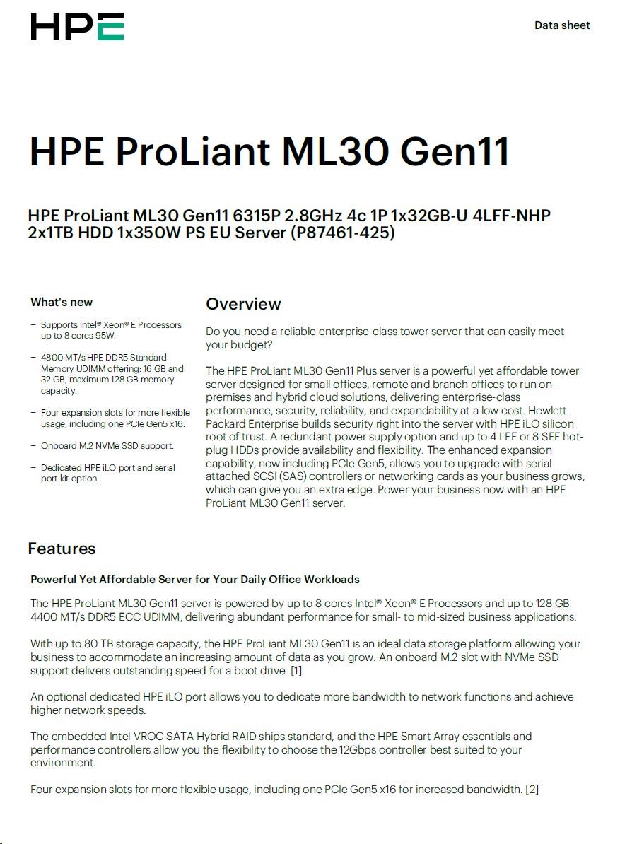 HPE PL ML30g11 6315P (2.8G/4C4T) 1x32G 2x1TB SATA 4LFF-NHP 1x350 VROC 4p1G NBD311 Smart Choice