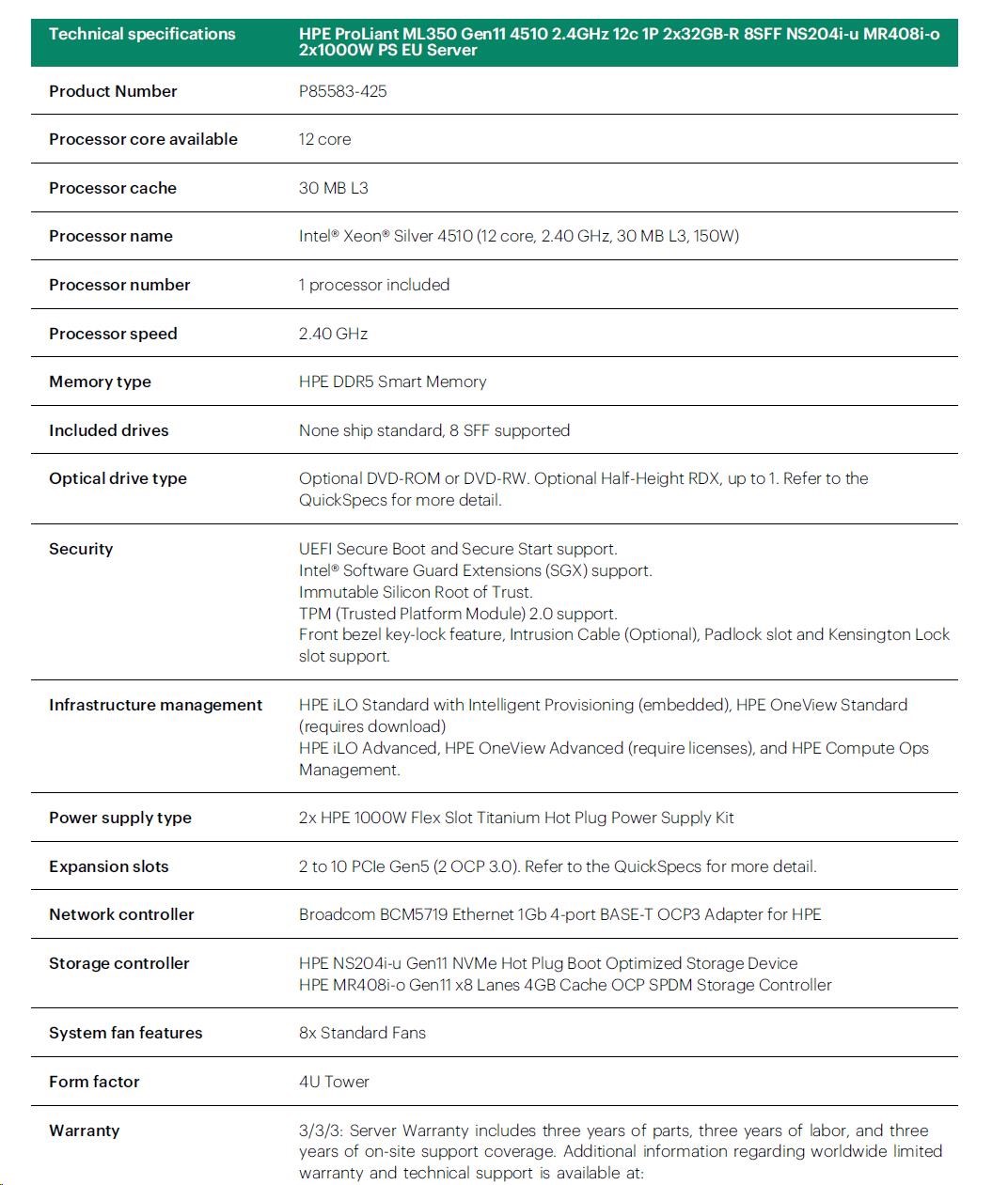 Provedení serveru:Tower; Výrobce CPU:Intel; Maximální počet procesorů:2; Řada procesorů:Intel 12 Core Xeon; SSD Kapacita (GB):960; Model procesoru:Intel Xeon 4410Y; Velikost paměti RAM (GB):64; Maximální paměťová kapacita serveru (GB):3072; Maximální počet slotů PCIe:6 a více; Maximální počet HDD v serveru:24; Hot-plug cage pro HDD:2.5" SFF; RAID:1, 5, 10