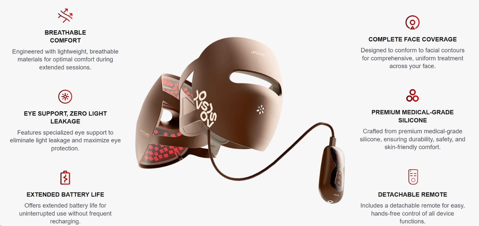Zapomeňte na těžké a nepohodlné plastové masky. JOVS LED maska je vyrobena z prémiového, lehkého a flexibilního silikonu lékařské kvality, který se dokonale přizpůsobí unikátním konturám vaší tváře. Tím je zajištěn optimální kontakt s pokožkou a rovnoměrné ošetření. Integrované silikonové očnice účinně blokují LED světlo, ale nebrání vám ve výhledu, takže můžete během procedury pohodlně relaxovat. Díky bezdrátovému provedení máte naprostou volnost pohybu.