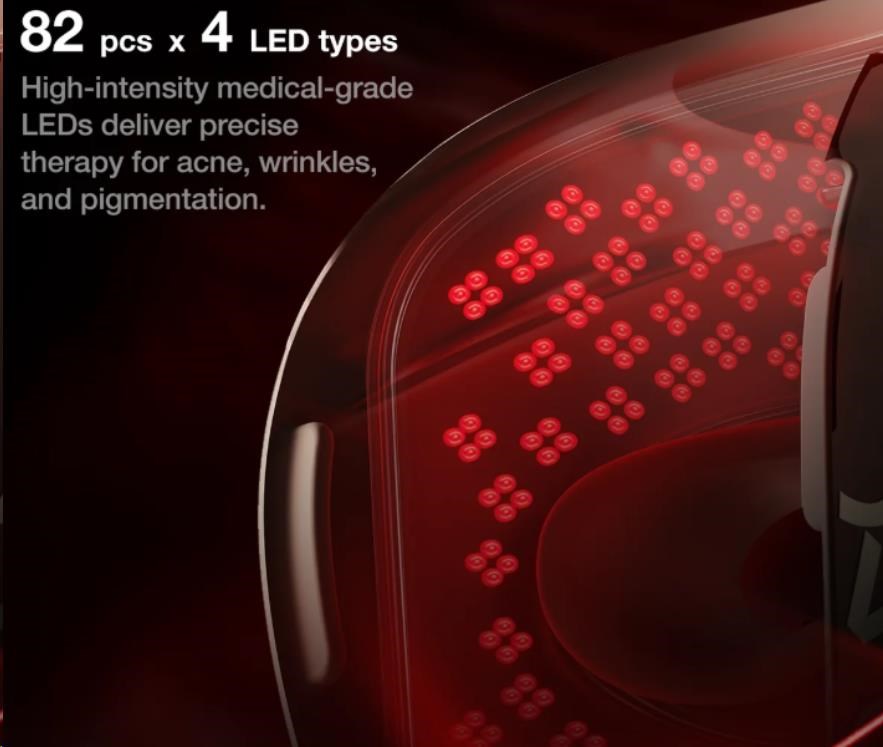 Tato maska není jen obyčejným doplňkem – je to výkonný nástroj pro komplexní omlazení a léčbu pleti. V jejím srdci se skrývá celkem 328 (82 x 4) vysoce intenzivních LED diod, které vyzařují čtyři typy klinicky ověřeného světla. Každá vlnová délka cílí na specifické problémy v různých vrstvách pokožky – od boje proti akné, přes rozjasnění pleti, až po hloubkovou stimulaci kolagenu pro redukci vrásek.