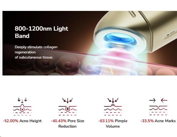 - Dvojitá rázová vlna světla: Kombinuje dvě pásma (400-600nm & 800-1200nm) pro komplexní účinek – ničení bakterií a regulaci mazu.
