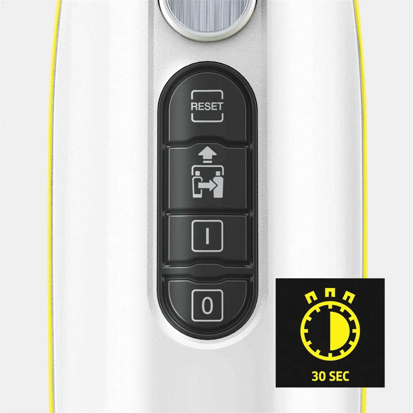 * Testy ukázaly, že při bodovém čištění po dobu 30 sekund při max. výkonu páry a přímým kontaktem s čisticím povrchem lze s parním čističem Kärcher odstranit 99,999 % obalených virů, jako je koronavirus nebo chřipka (s výjimkou viru hepatitidy B) na běžných hladkých tvrdých površích v domácnostech (testovaný zárodek: modifikovaný virus vakcína Ankara).