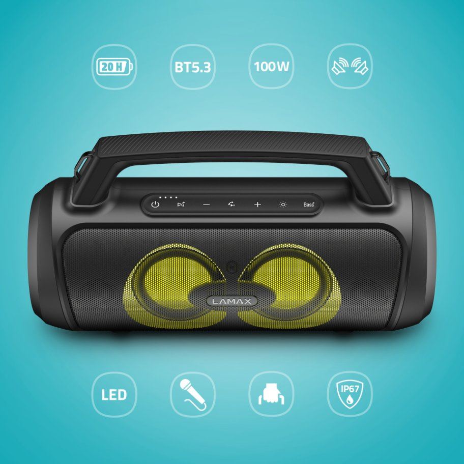 Přenosný Bluetooth party reproduktor s madlem, BT 5.3, výkon 100 W, 3 režimy LED podsvícení, 20 hodin výdrž, ovládání přes zařízení s iOS nebo Android, drátový mikrofon v balení, LAMAX BeatBass®, voděodolnost IP67, 6,3 mm jack, SD karta, USB-A vstup, funkce powerbanky, TWS funkce pro připojení druhého reproduktoru.