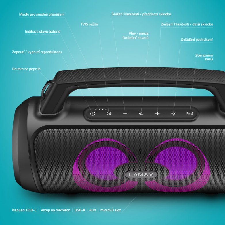 Malé tělo s velkým výkonemRozjeď kdekoliv i neplánovanou party ve velkém stylu. Přenosný party reproduktor LAMAX PartyGo1 je vzhledem malý, ale ukrývá v sobě velkou sílu, výkon 100 W. Technologie BeatBass® mu dává silný, plný a bohatý zvuk. Grilovačku, narozeninovou oslavu nebo menší party oživí 3 režimy LED podsvícení a možnost připojení mikrofonu, když si chceš užít karaoke nebo akci moderovat. Reprák se automaticky spáruje s jakýmkoliv zařízením prostřednictvím Bluetooth 5.3, který poskytuje bezchybný přenos až na 18 m. Na pohodu s tebou bude nový parťák i cestovat, baterie mu vydrží až 20 hodin a má navíc šikovné madlo nebo popruh přes rameno. Připojíš ho jak přes BT, tak USB, microSD, případně AUX a umí se proměnit taky v powerbanku přes USB-A vstup. A když jeden reprák nestačí, můžeš ho spárovat s druhým.