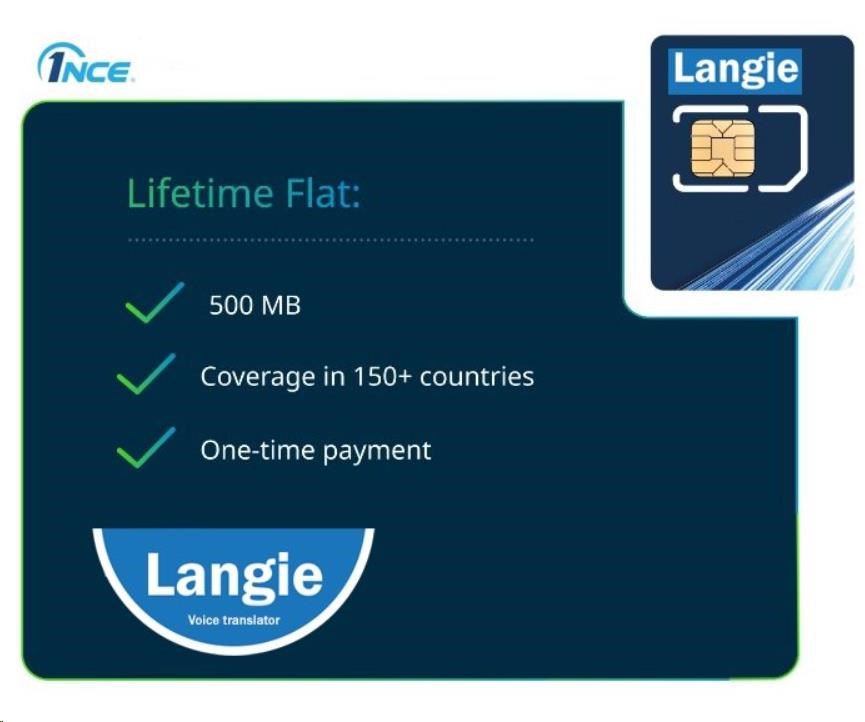 LANGIE ULTRA SIM je ultimátna SIM karta s predplateným objemom dát 500MB s podporou - 2G/3G/4G/LTE pre preklad v 150 krajinách s platnosťou do 10 rokov (alebo do vyčerpania dát). S touto unikátnou SIM kartou môžete využívať všetky funkcie LANGIE prekladača ako sú vyhľadávanie obrázkov, skupinový prekladač, jazykový klub, vytvorenie prístupového bodu - HOTSPOTU a to všetko v 150 krajinách sveta.