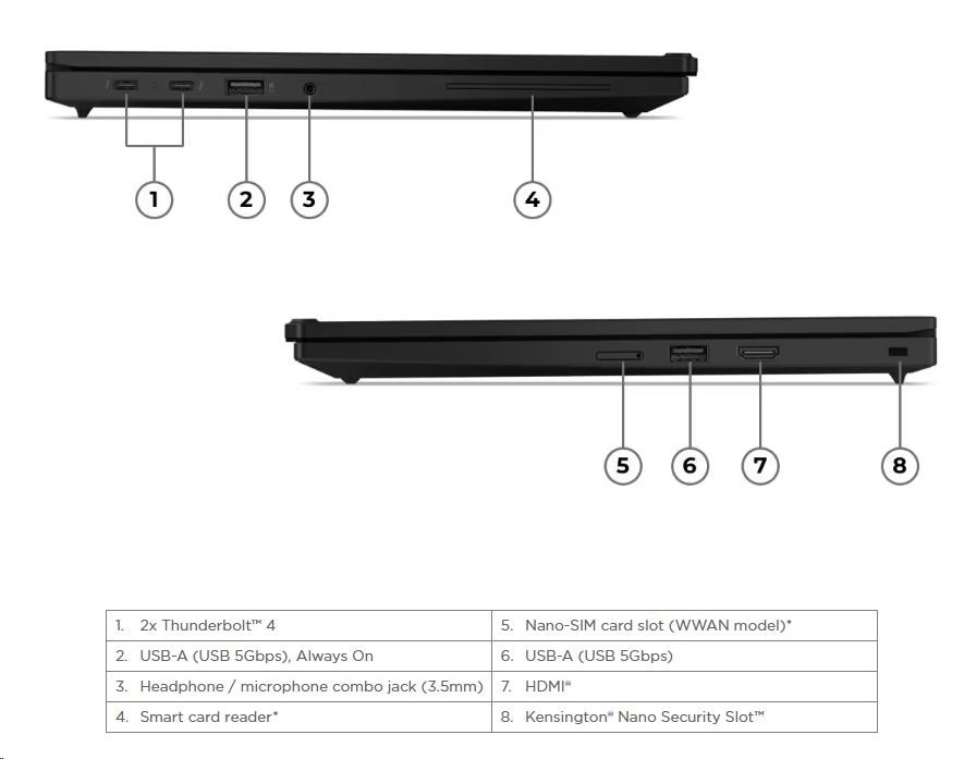 Standartné porty | 2x USB-A (USB 5Gbps / USB 3.2 Gen 1), one Always On 2x USB-C® (Thunderbolt™ 4 / USB4® 40Gbps), with USB PD 3.1 and DisplayPort™ 2.1 1x HDMI® 2.1, up to 4K/60Hz 1x Headphone / microphone combo jack (3.5mm) |
