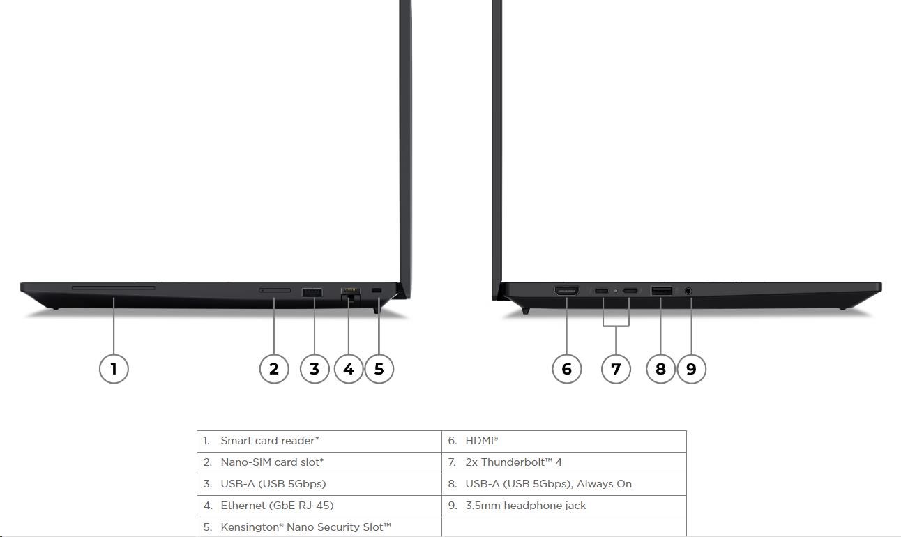 | Standartné porty | 1x USB-A (USB 5Gbps / USB 3.2 Gen 1) 1x USB-A (USB 5Gbps / USB 3.2 Gen 1), Always On 2x USB-C® (Thunderbolt™ 4 / USB4® 40Gbps), with USB PD 3.0 and DisplayPort™ 2.1 1x HDMI® 2.1, up to 4K/60Hz 1x Headphone / microphone combo jack (3.5mm) 1x Ethernet (RJ-45) 1x Security keyhole |