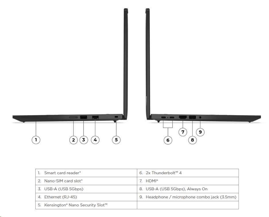 | Standartné porty | 1x USB-A (USB 5Gbps / USB 3.2 Gen 1) 1x USB-A (USB 5Gbps / USB 3.2 Gen 1), Always On 2x USB-C® (Thunderbolt™ 4 / USB4® 40Gbps), with USB PD 3.0 and DisplayPort™ 2.1 1x HDMI® 2.1, up to 4K/60Hz 1x Headphone / microphone combo jack (3.5mm) 1x Ethernet (RJ-45) 1x Smart Card Reader 1x Nano-SIM Card Slot |