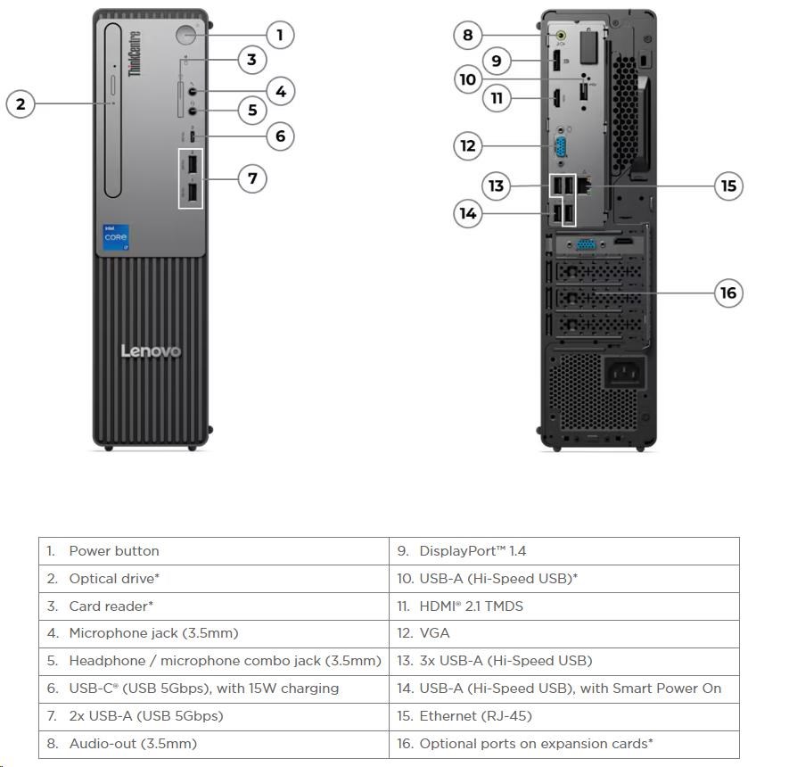 | Zadné porty | 4x USB-A (Hi-Speed USB / USB 2.0), one supports Smart Power On 1x HDMI® 2.1 TMDS 1x DisplayPort™ 1.4 1x VGA 1x Ethernet (RJ-45) 1x line-out (3.5mm) |