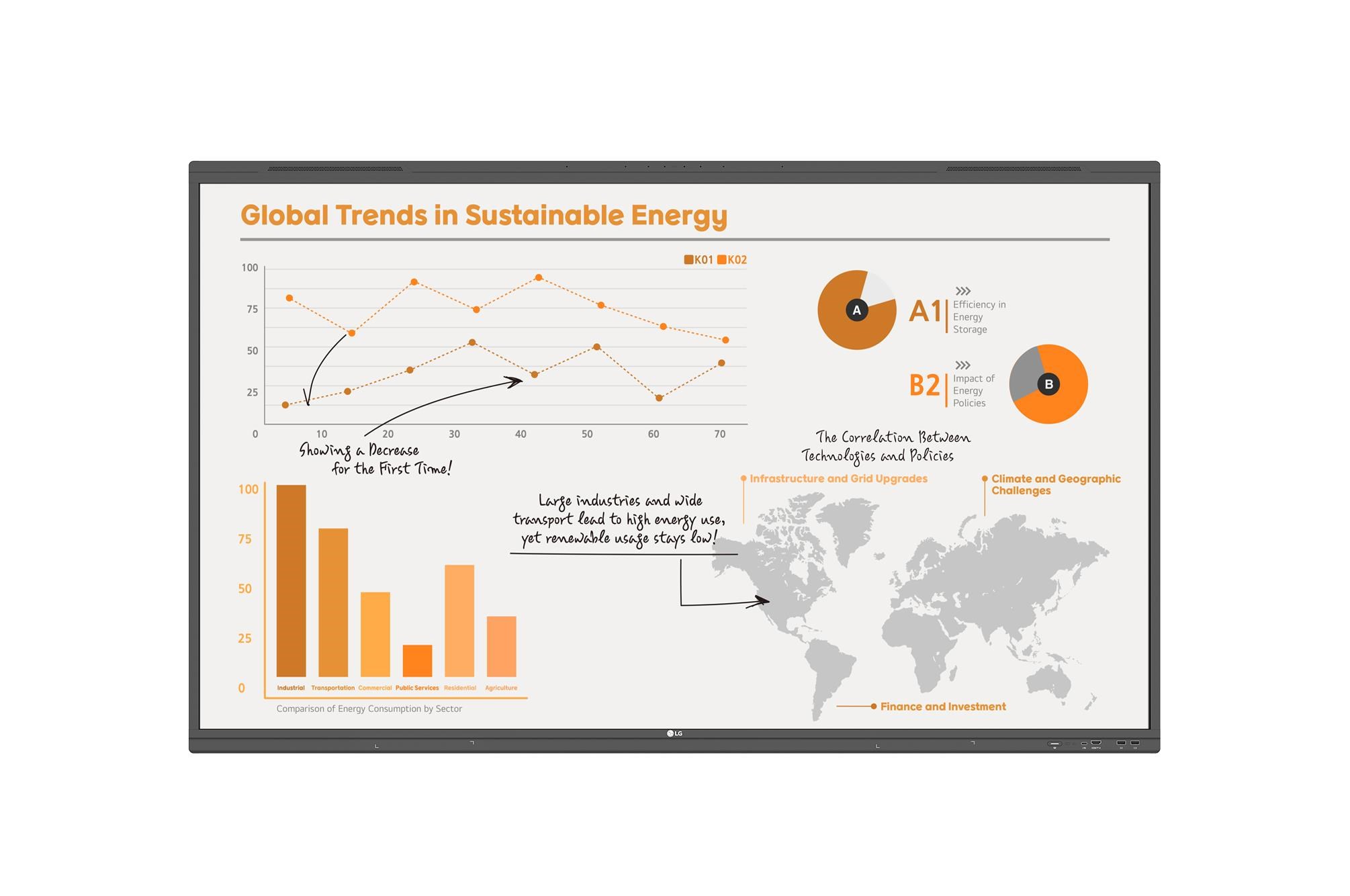 LG CreateBoard poskytuje realistický dotykový zážitek, který uživatelům umožňuje interakci s obsahem přímo na obrazovce – psaní, kreslení, přiblížení nebo otáčení obsahu pouhými prsty. Je ideální pro kreativní projekty nebo prezentace a navíc umožňuje sdílení obrazovky i obsahu, což výrazně podporuje spolupráci, a to i na dálku.