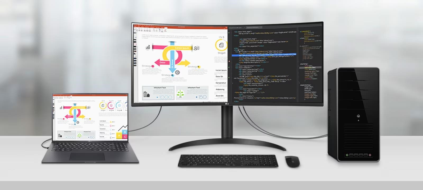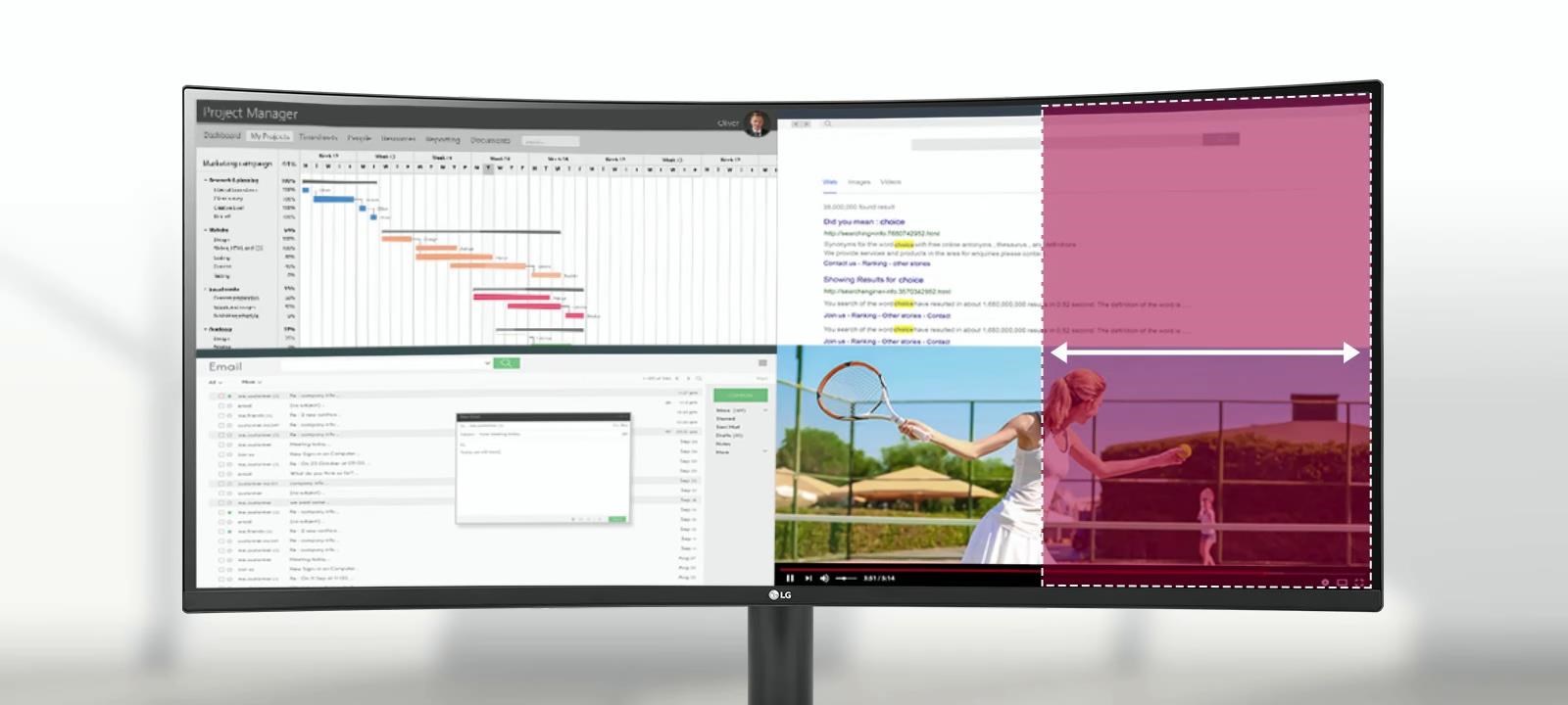 34WR55QK umožňuje zobrazit více obsahu ze dvou počítačů díky funkci obraz vedle obrazu, takže pomáhá zpracovávat práci efektivně.