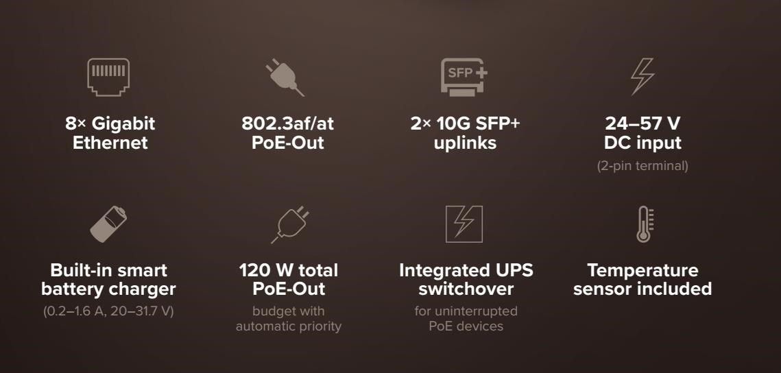 NetPower Lite 8P je vybaven osmi gigabitovými ethernetovými porty s výstupem PoE 802.3af/at a dvěma 10G SFP+ uplinky pro vysokorychlostní backhaul.