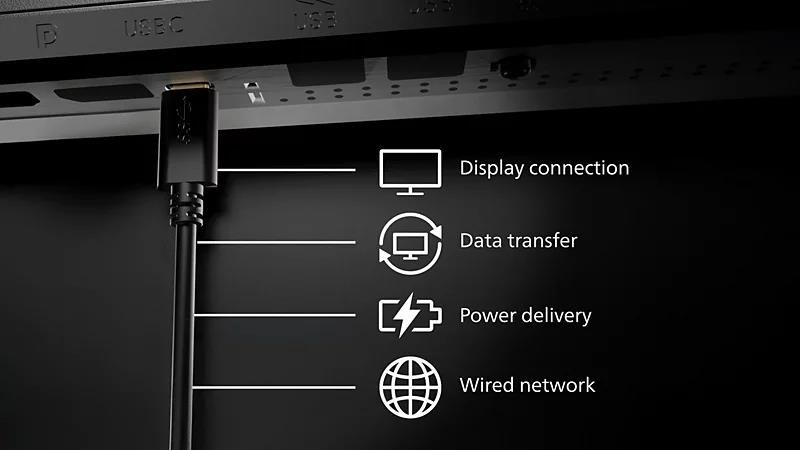 Zjednodušte připojení všech periferií z monitoru k počítači pomocí jednoho dokovacího kabelu s konektorem USB-C, včetně připojení k síti, výstupu videa ve vysokém rozlišení z počítače na monitor a surfování na internetu bez dalšího síťového kabelu, a to i bez portu LAN na notebooku. Připojení RJ45 přes USB-C nabízí rychlé a bezpečné připojení v případě potřeby. Získání nejvyšších rychlostí přenosu dat vám umožní přenášet data z pevného disku do počítače rychleji než kdykoli předtím. Kromě toho vám rozhraní USB-C s napájením může dokonce umožnit napájet a nabíjet notebook přes monitor, čímž odpadá potřeba dalších napájecích kabelů.