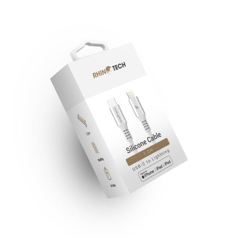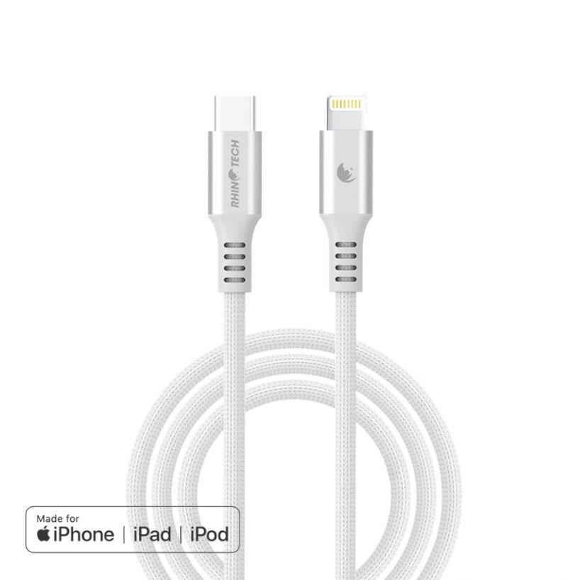 Kvalitní RhinoTech datový a nabíjecí MFi kabel z odolného nylonového materiálu s konektory USB-C na Lightning o délce 1,2m v elegantní stříbrné barvě.
