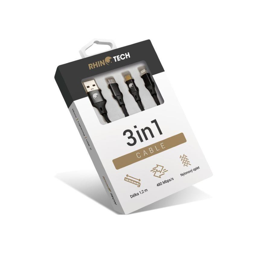 Kvalitní RhinoTech opletený multifunkční datový a nabíjecí kabel 3v1 s konektorem USB, zakončený hned trojicí konektorů (Lightning nabíjecí/datový port, USB-C nabíjecí port a MicroUSB – nabíjecí port).